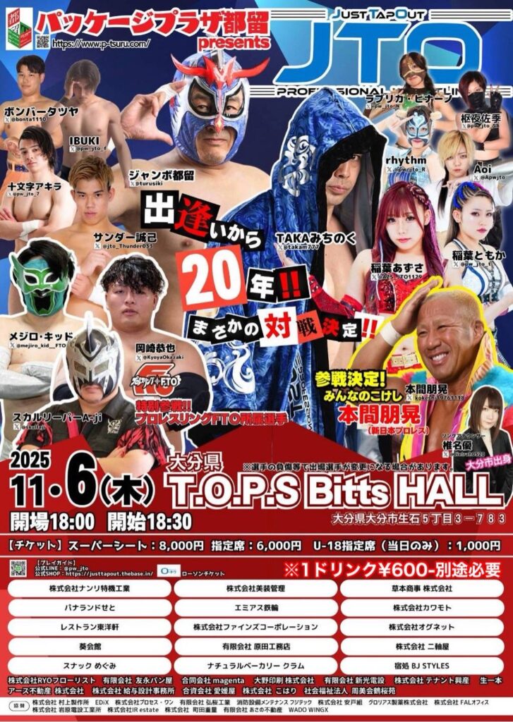 大会概要 主催JTO日程2025年11月6日(木)時間開場18:00・開始18:30場所大分県・T.O.P.S BittsHALLその他別途ドリンク代¥600が必要となります。 チケットのご購入はこちら JTOオンラインショップ ローソンチケット 決定分対戦カード 参戦選手プロフィールはこちら JTO選手プロフィール一覧へ スケジュール/チケット URLをコピーしました!