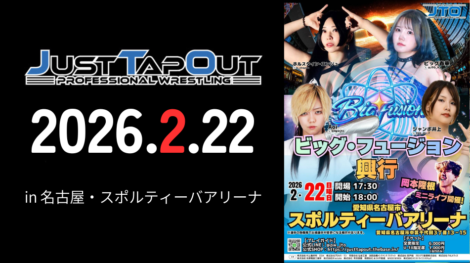 大会概要 主催JTO日程2026年2月22日(日)時間開場17:30・開始18:00場所愛知県名古屋市・スポルティーバアリーナその他- チケットのご購入はこちら 決定分対戦カード 参戦選手プロフィールはこちら JTO選手プロフィール一覧へ -
