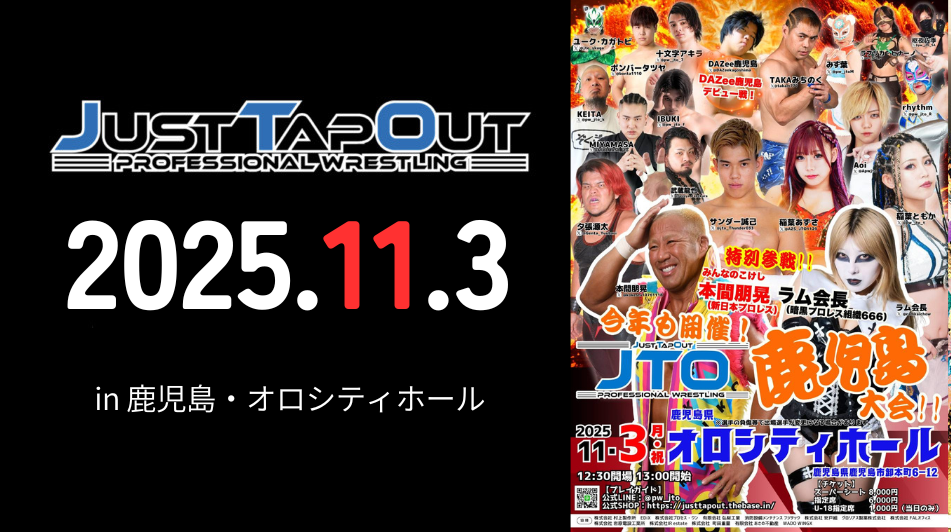大会概要 主催JTO日程2025年11月3日(月・祝)時間開場12:30・開始13:00場所鹿児島県・オロシティホールその他- チケットのご購入はこちら JTOオンラインショップ ローソンチケット 決定分対戦カード 参戦選手プロフィールはこちら JTO選手プロフィール一覧へ
