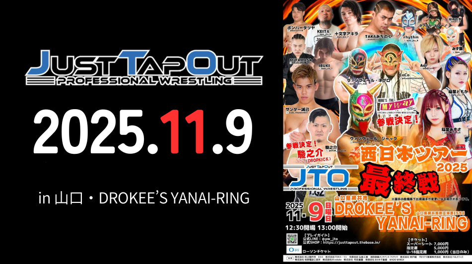 大会概要 主催JTO日程2025年11月9日(日)時間開場12:30・開始13:00場所山口・DROKEE'S YANAI-RINGその他- チケットのご購入はこちら 決定分対戦カード 参戦選手プロフィールはこちら JTO選手プロフィール一覧へ -