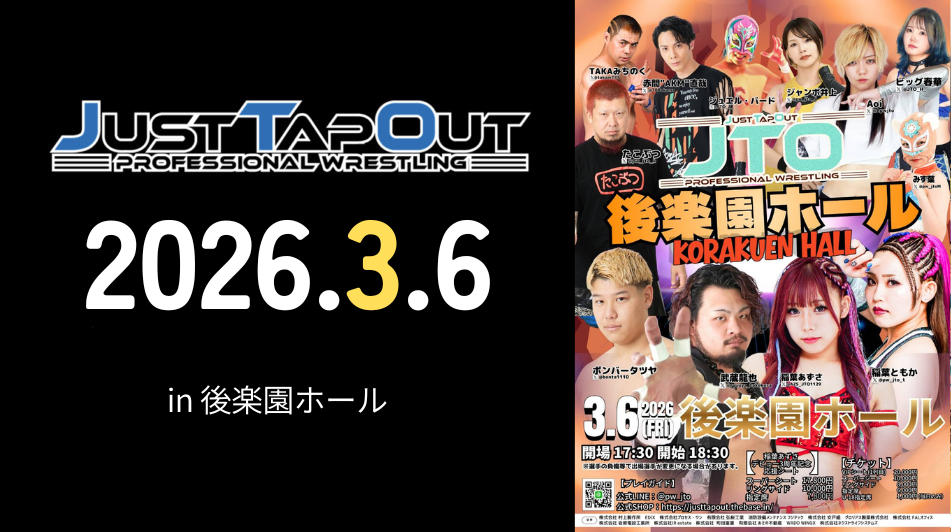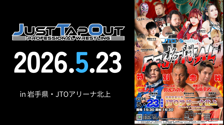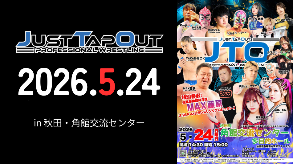 大会名:5.5 JTO HOUSE 横浜にぎわい座大会 開催日2025年5月5日(月・祝)会場横浜にぎわい座時間開場12:30・開始13:00観衆63人 【エキシビションマッチ】 5分間エキシビションマッチ 十文字アキラ0-0練習生TBS 【第1試合】 タッグマッチ 30分1本勝負 TAKA... -