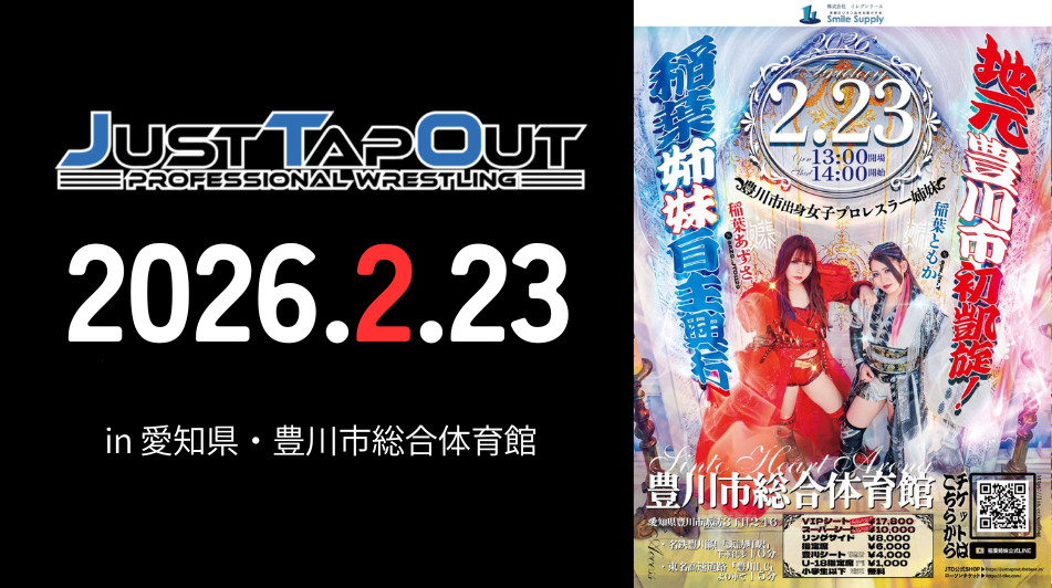 大会名:2.23 株式会社 イレブンリースpresents稲葉姉妹自主興行 愛知県 豊川市総合体育館 開催日2026年2月23日(月)会場愛知県・豊川市総合体育館時間開場15:30・開始16:00観衆-人 【第1試合】 シングルマッチ 30分1本勝負 ⚪︎TAKAみちのく8分43... 試合結果